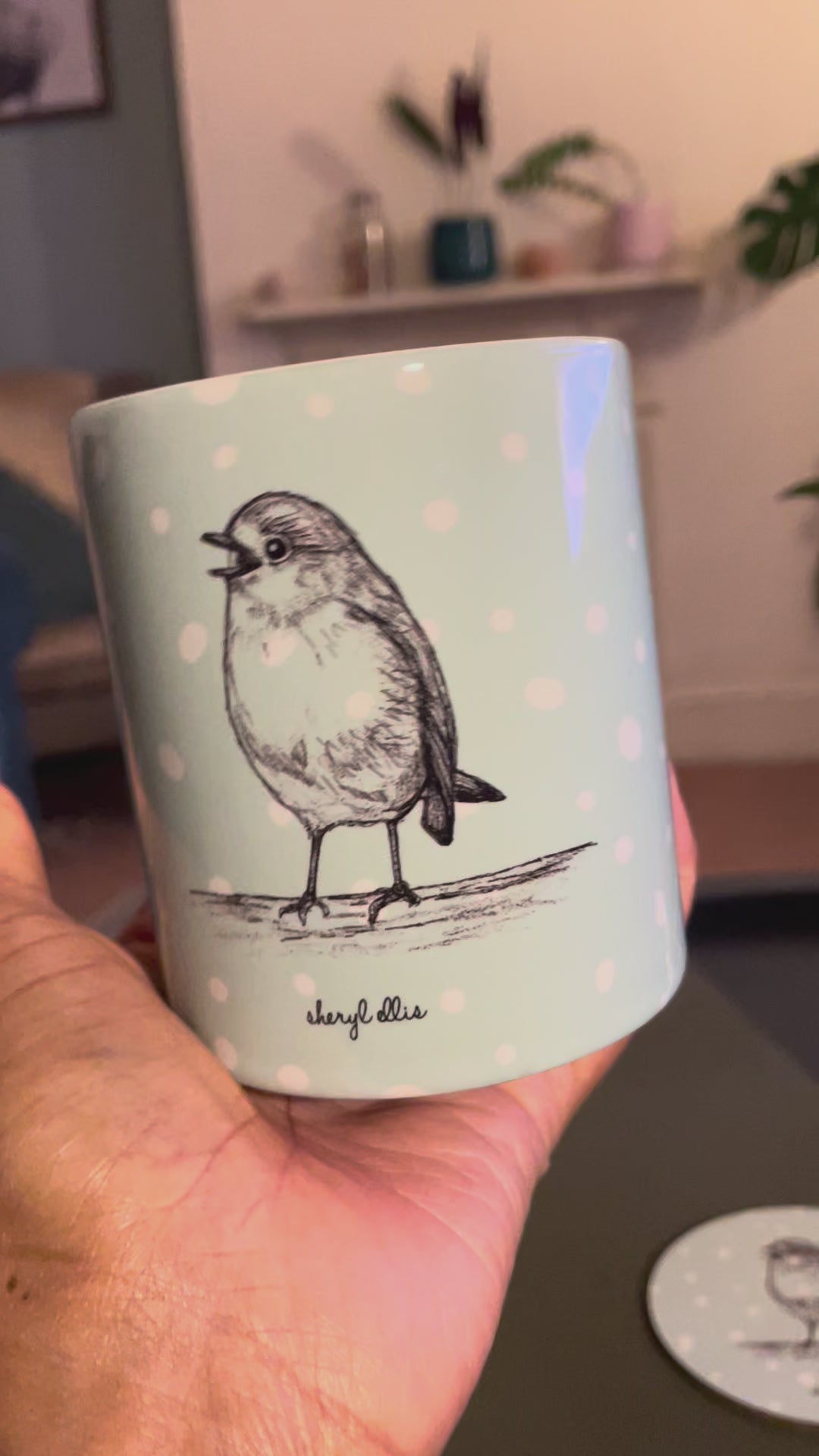 A ceramic mug featuring my Chirping Robin illustration, and a matching coaster with the same artwork. The colours are soothing, the finish is smooth and durable, and everything is produced locally in the UK to keep quality high and production responsible.